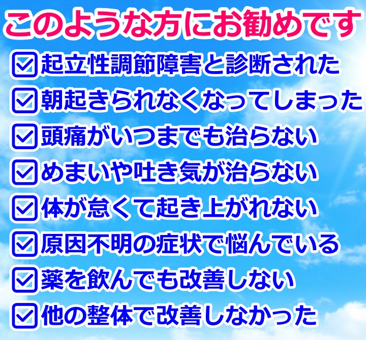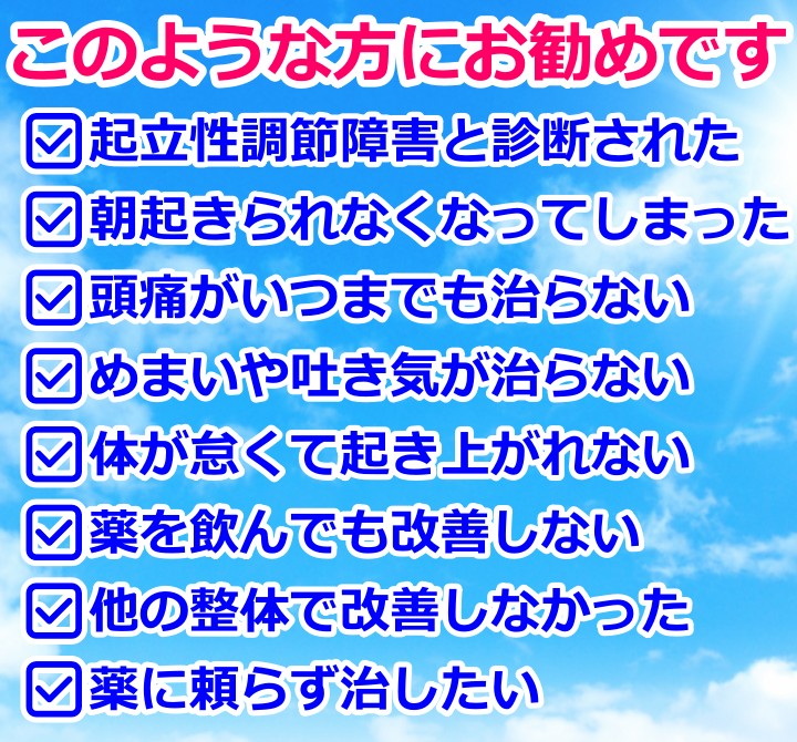 頭痛、朝起きられない、立ちくらみ、吐き気、起立性調節障害などのお悩み。